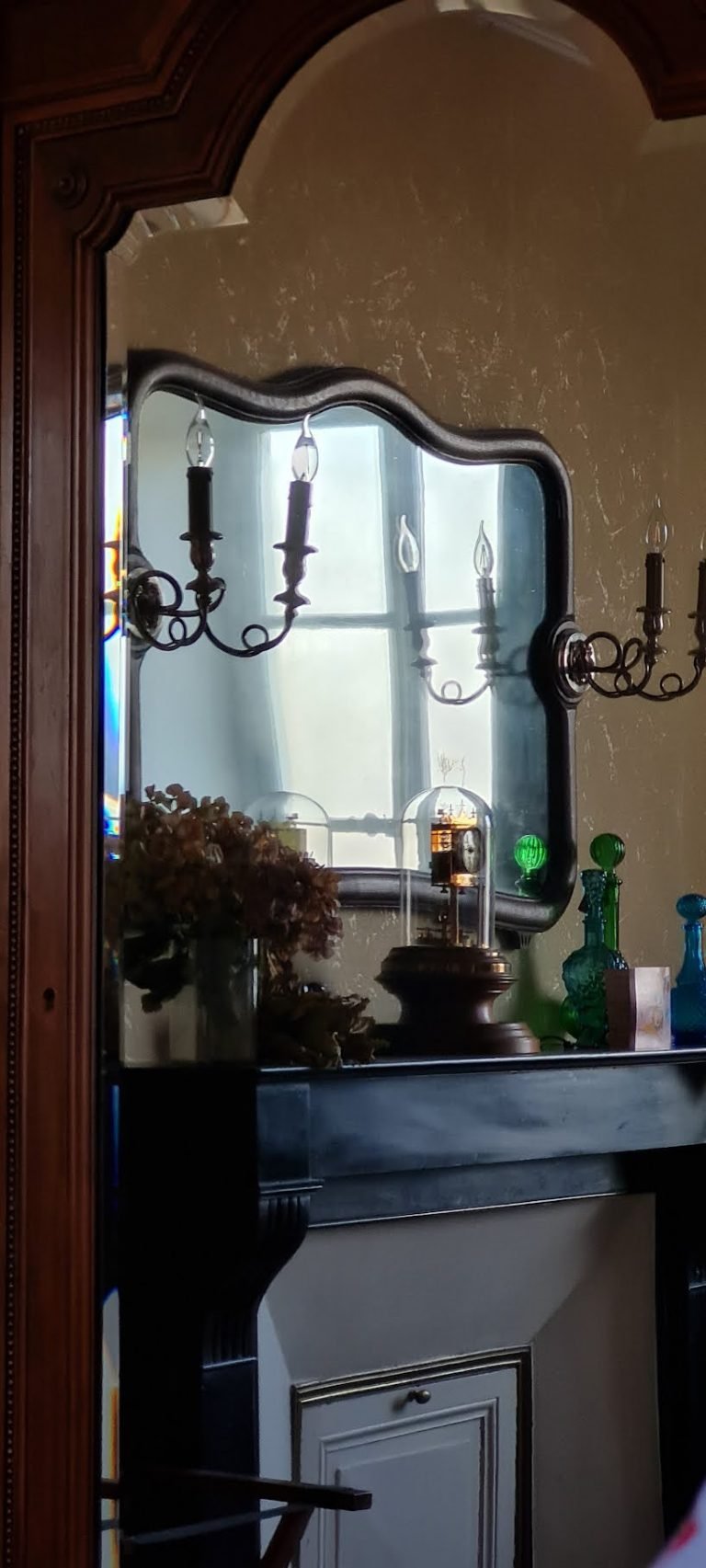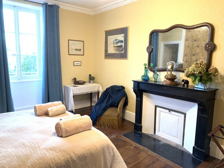 La chambre principale : équipée d’un lit Queen Size, elle offre une ambiance élégante avec sa cheminée et une fenêtre donnant sur la cour du château. Un petit couloir mène à la seconde pièce.